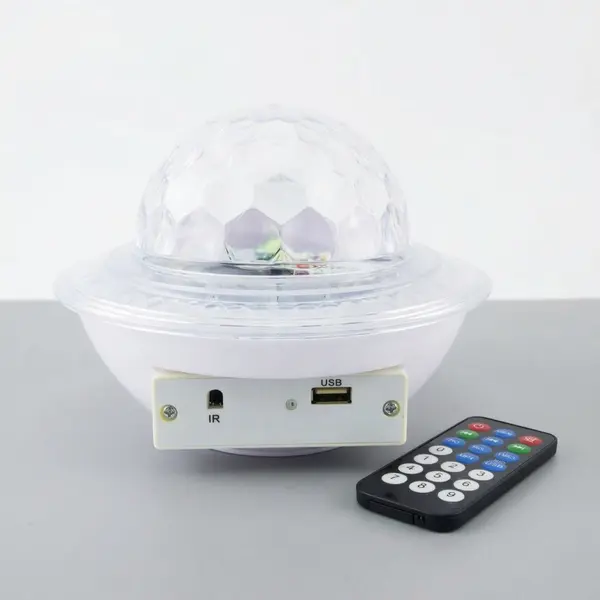 Designul său sub formă de cupolă de cristal transparent proiectează modele multicolore fascinante pe pereți și tavan, acoperind un unghi larg de iluminare. În același timp, difuzoarele stereo integrate îți permit să asculți muzica preferată direct de pe telefon prin Bluetooth sau de pe un stick USB, oferind un sunet clar și puternic.