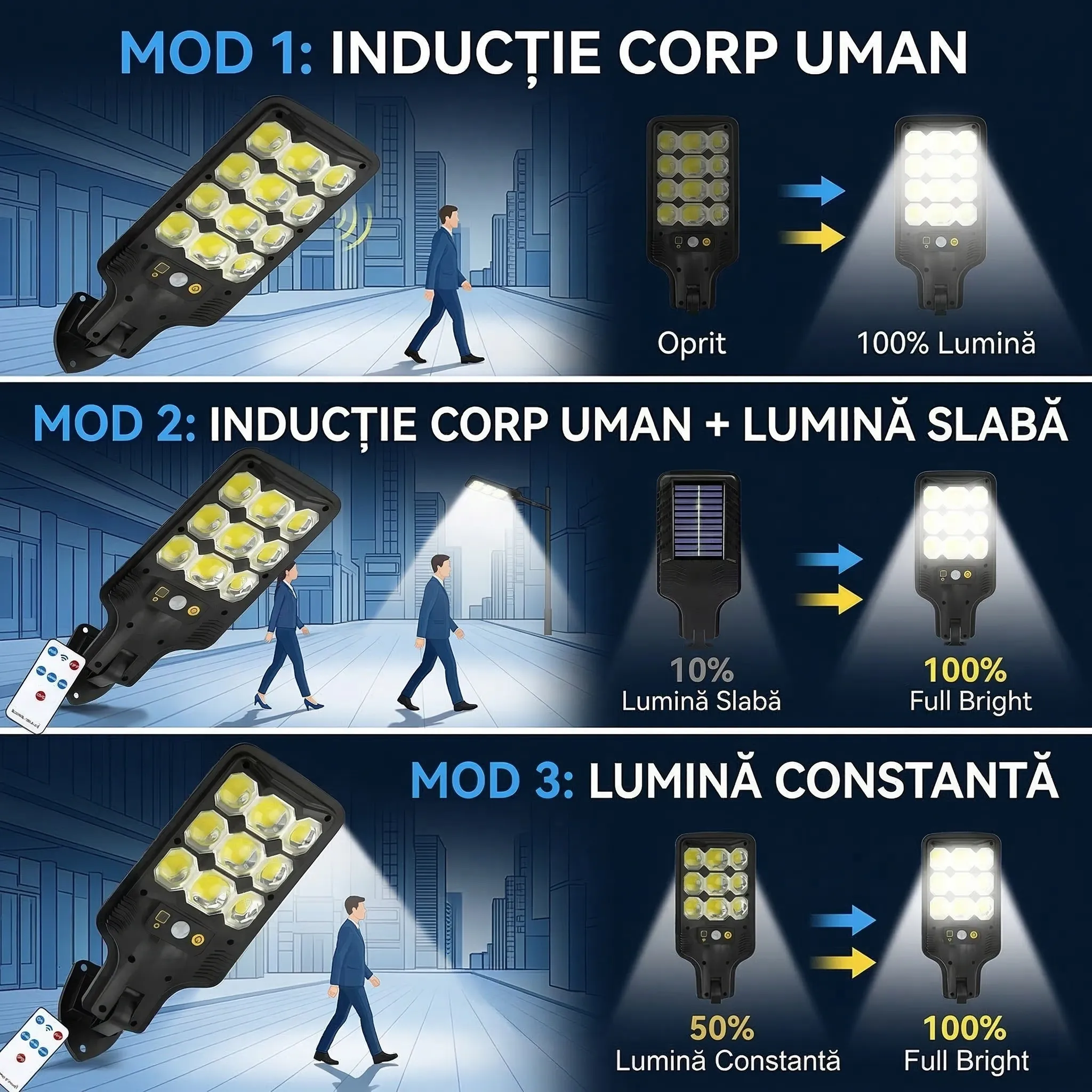 - Control de la Distanță: Telecomanda inclusă îți permite să schimbi cu ușurință între cele 3 moduri de funcționare, adaptând intensitatea și durata luminii în funcție de nevoile tale.