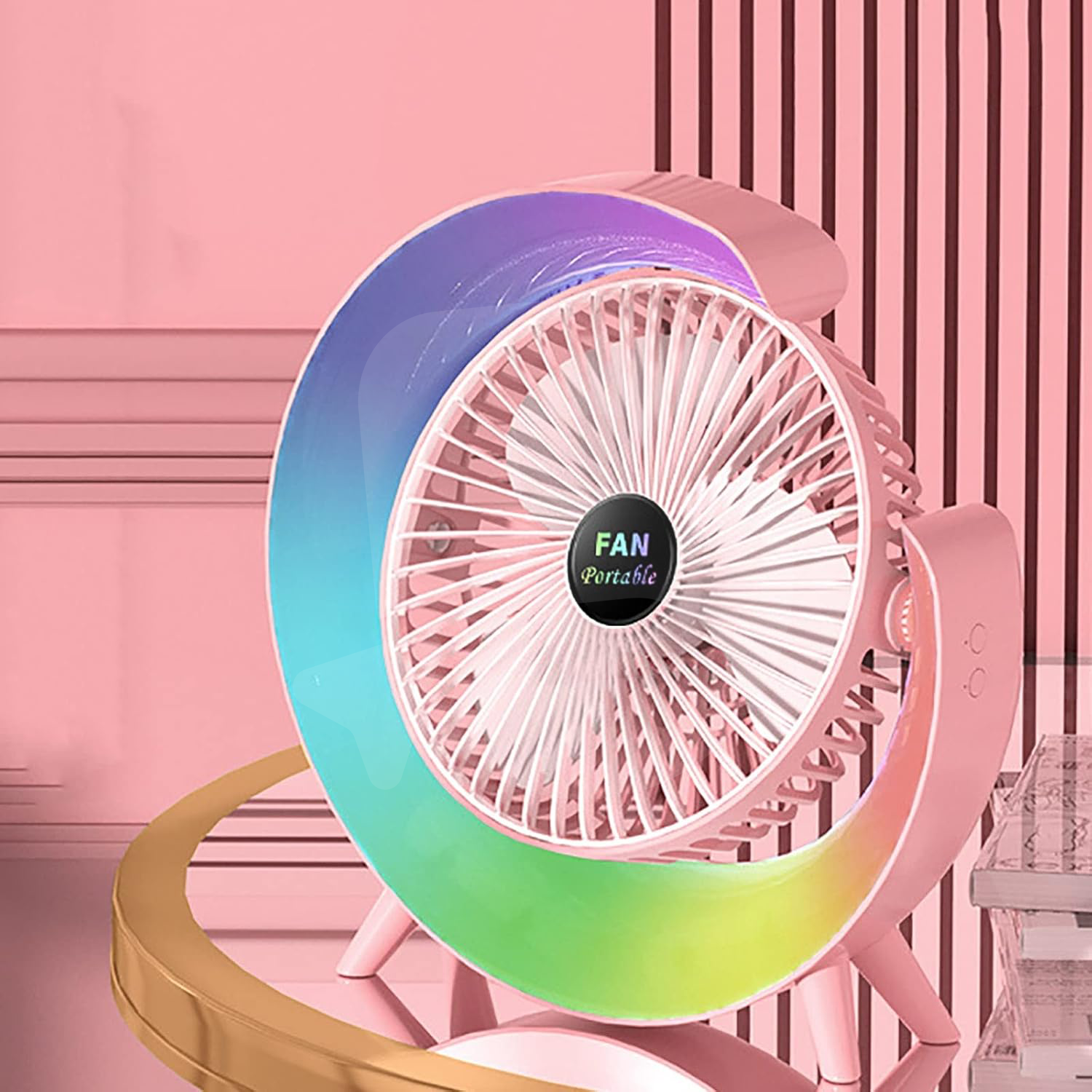 Mini ventilatorul portabil multifuncțional cu LED RGB este o soluție modernă și practică pentru răcorire personală în spații interioare și exterioare, fiind conceput pentru utilizare zilnică, mobilitate și consum redus de energie. Datorită dimensiunilor compacte și designului rotund, acest ventilator portabil este ideal pentru birou, desktop, locuință, mașină, camping, călătorii sau alte activități unde este necesară o sursă eficientă de ventilație.