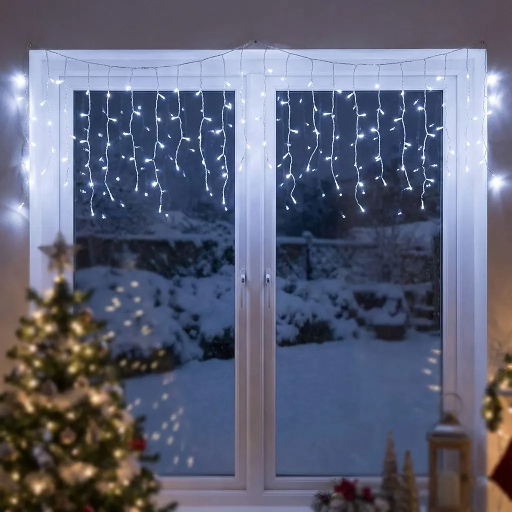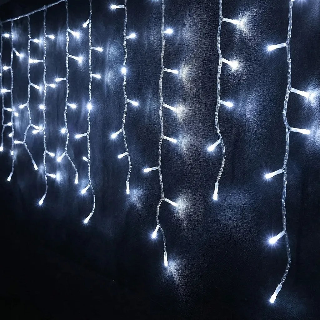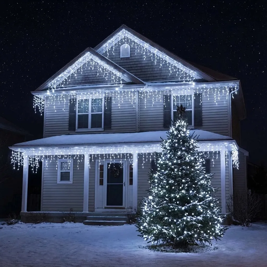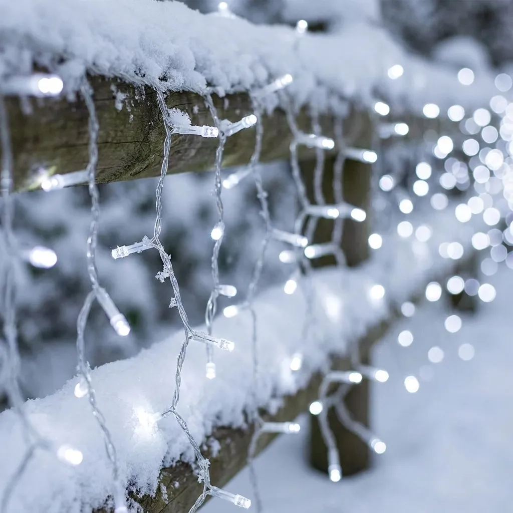 Designul cu franjuri de lungimi diferite creează o profunzime vizuală deosebită, imitând reflexia turturilor de gheață sub lumina lunii. Lumina alb rece este intensă și clară, oferind un aspect modern și rafinat care se integrează perfect în peisajele de iarnă, fie că alegi să decorezi cornișele casei sau ferestrele mari de la interior.