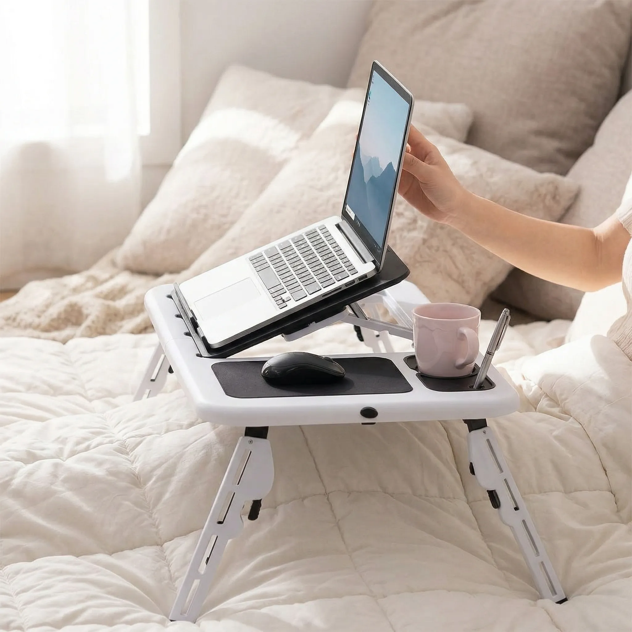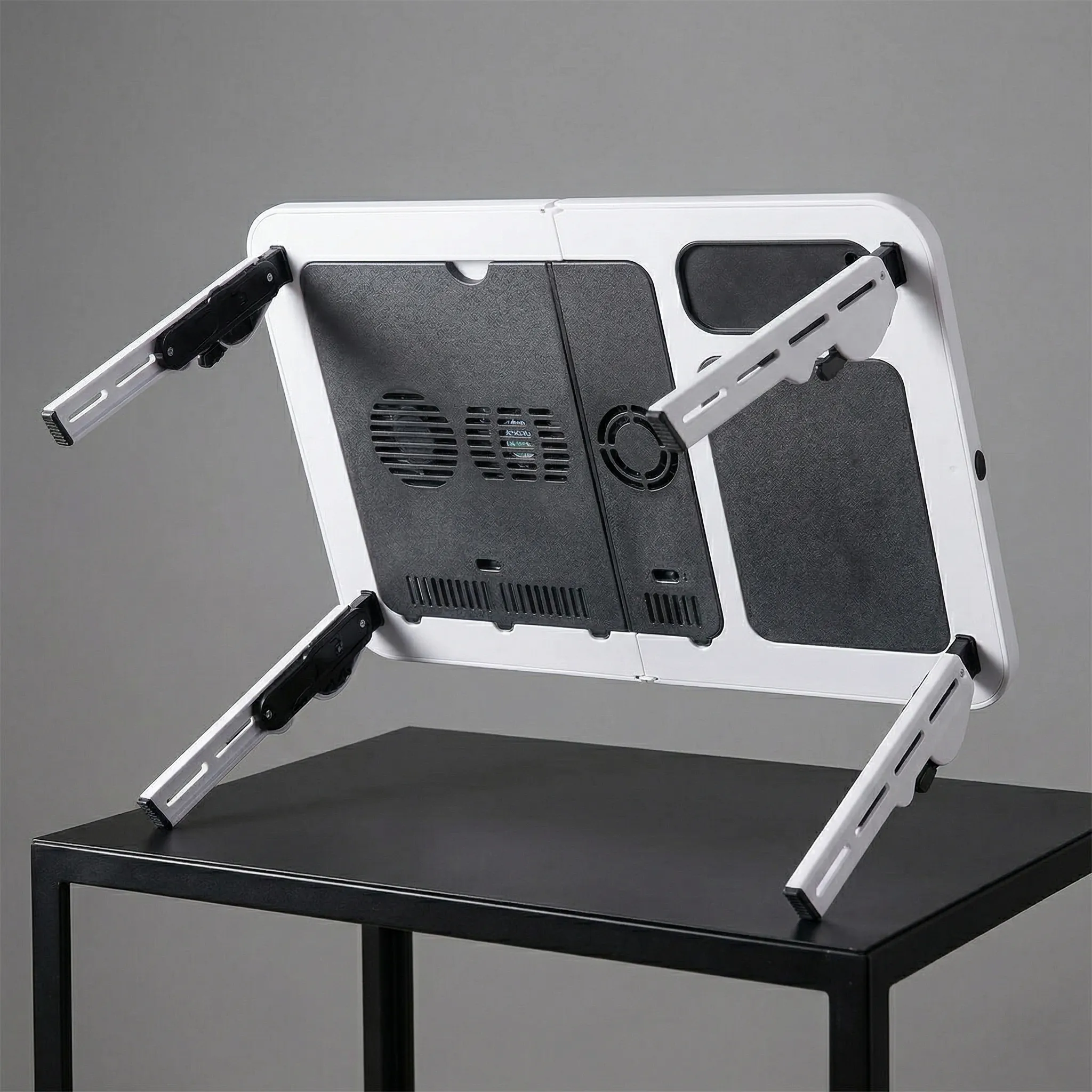 - Ajustabilitate Totală (Înălțime și Unghi): Picioarele telescopice și blatul reglabil îți permit să găsești unghiul perfect de vizualizare și tastare. Reduci tensiunea din gât, umeri și încheieturi, transformând orele de muncă sau vizionare de filme într-o experiență relaxantă.