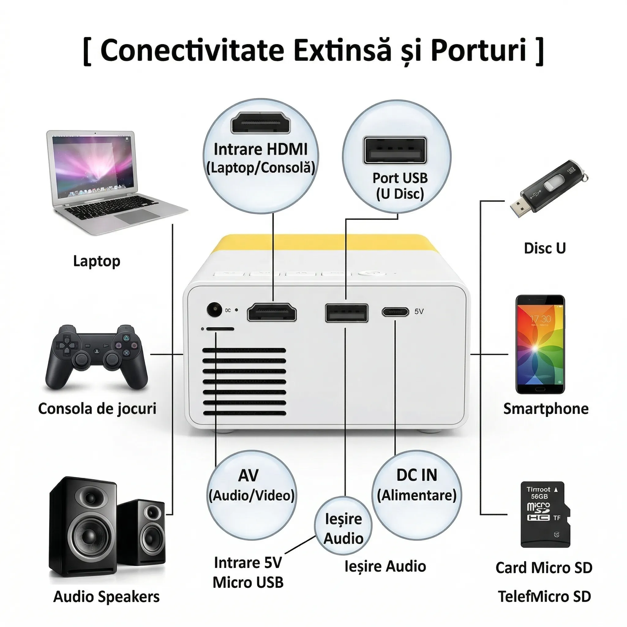- Conectivitate Universală: Indiferent de sursa de conținut, YG-300 este gata de acțiune. Dispune de interfețe HDMI, USB, TF Card și Audio 3.5mm, fiind compatibil cu laptopuri, PC-uri, console de jocuri (PS4, Xbox) și sisteme audio externe.