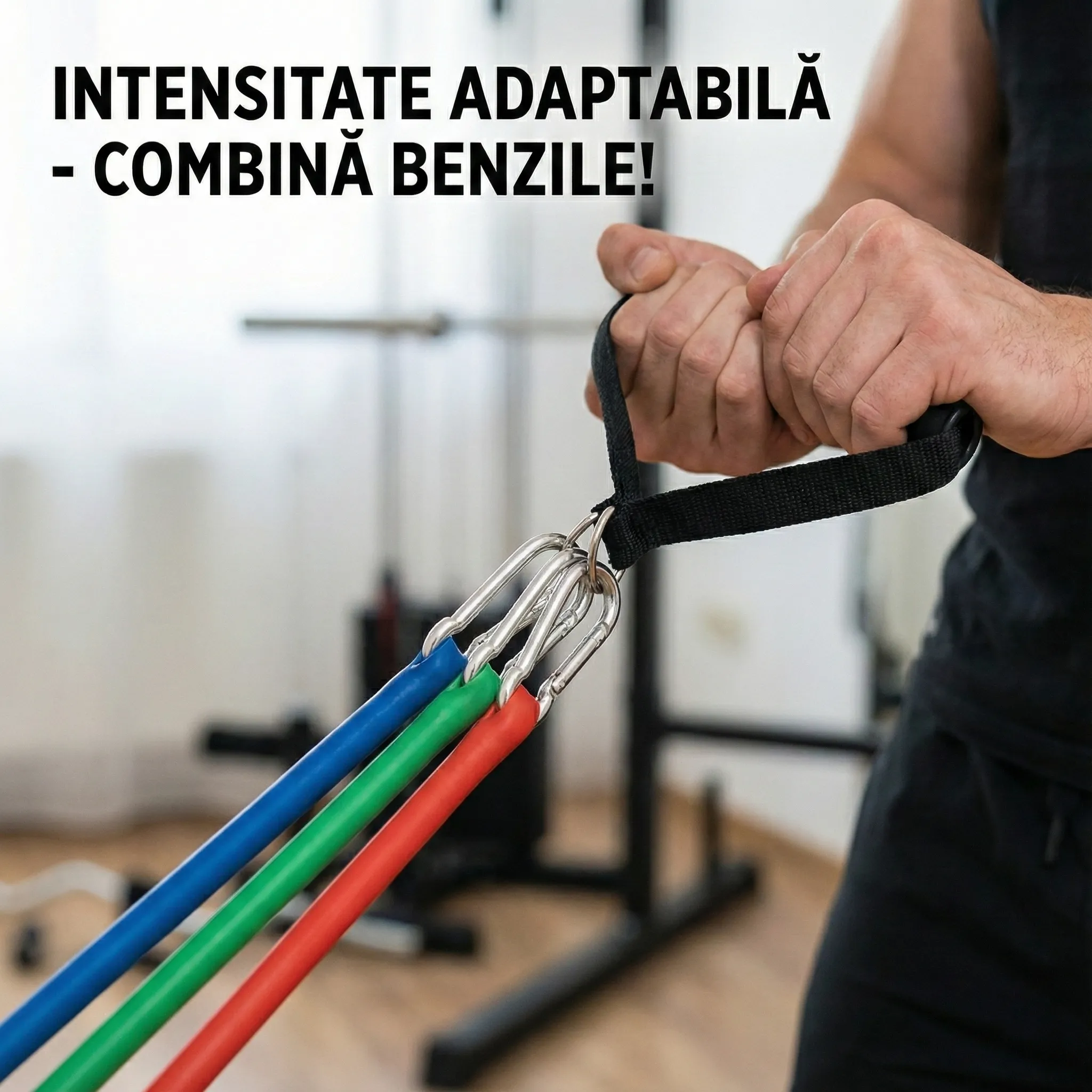 Fiecare dintre cele 5 tuburi elastice are o rezistență diferită, marcată prin culori specifice (de la 6.8 kg la 16 kg). Marea inovație constă în posibilitatea de a combina benzile pe aceleași mânere, ajungând la o intensitate totală de până la 57 kg. Astfel, setul „crește” odată cu tine, fiind potrivit atât pentru începători în faza de recuperare, cât și pentru sportivi avansați care doresc tonifiere intensă.