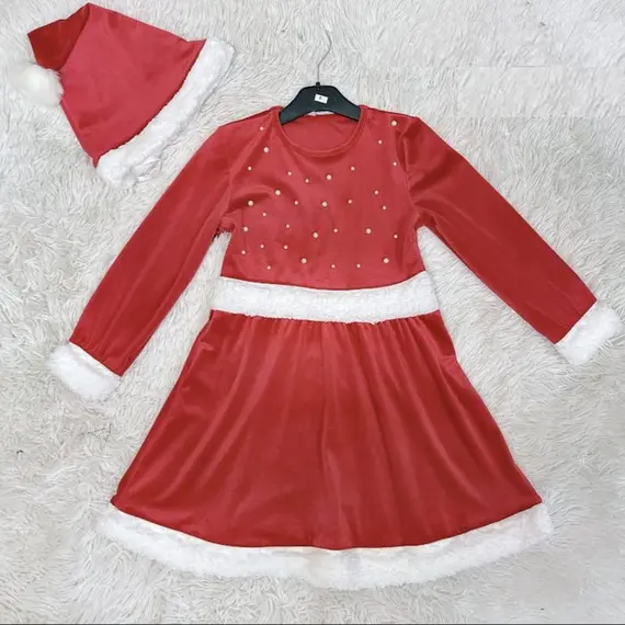 Modelul este completat de margini pufoase albe la mâneci, talie și tiv, care îi conferă un stil inspirat de costumul clasic de Moș Crăciun. Aplicațiile discrete cu perle adaugă un plus de rafinament și eleganță. Rochia vine însoțită de o căciuliță asortată, perfectă pentru poze de Crăciun, serbări sau petreceri tematice.