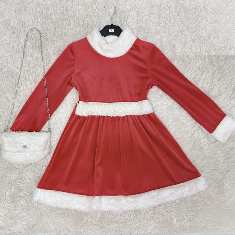 Un detaliu special al acestui model este poșetuța asortată, decorată cu blăniță albă și lanț argintiu, perfectă pentru a completa ținuta micilor domnișoare. Rochia este comodă, elegantă și ideală pentru serbări, petreceri de Crăciun, ședințe foto sau cadouri de sezon.