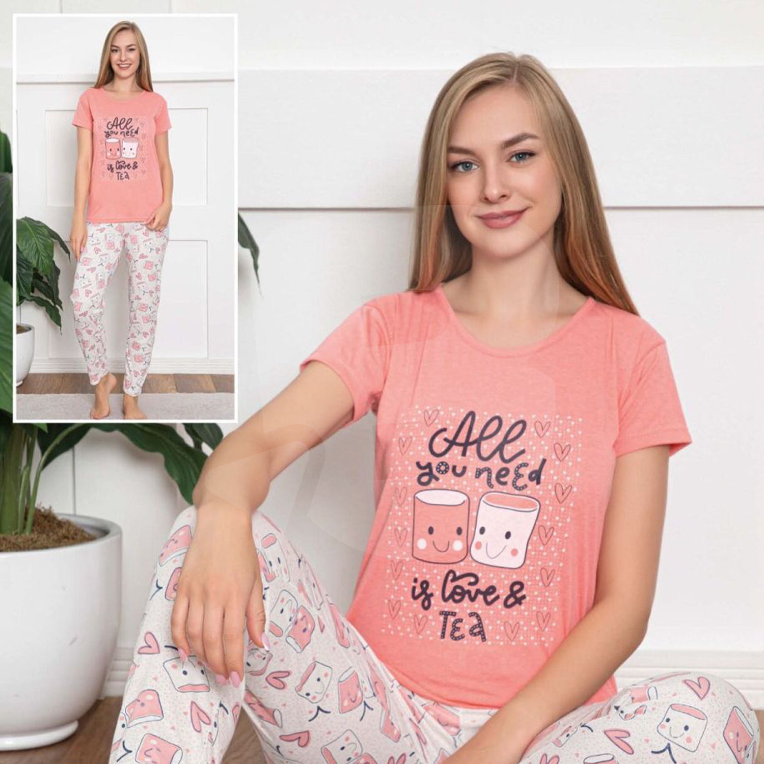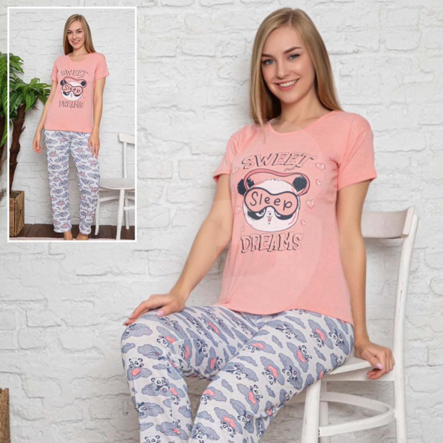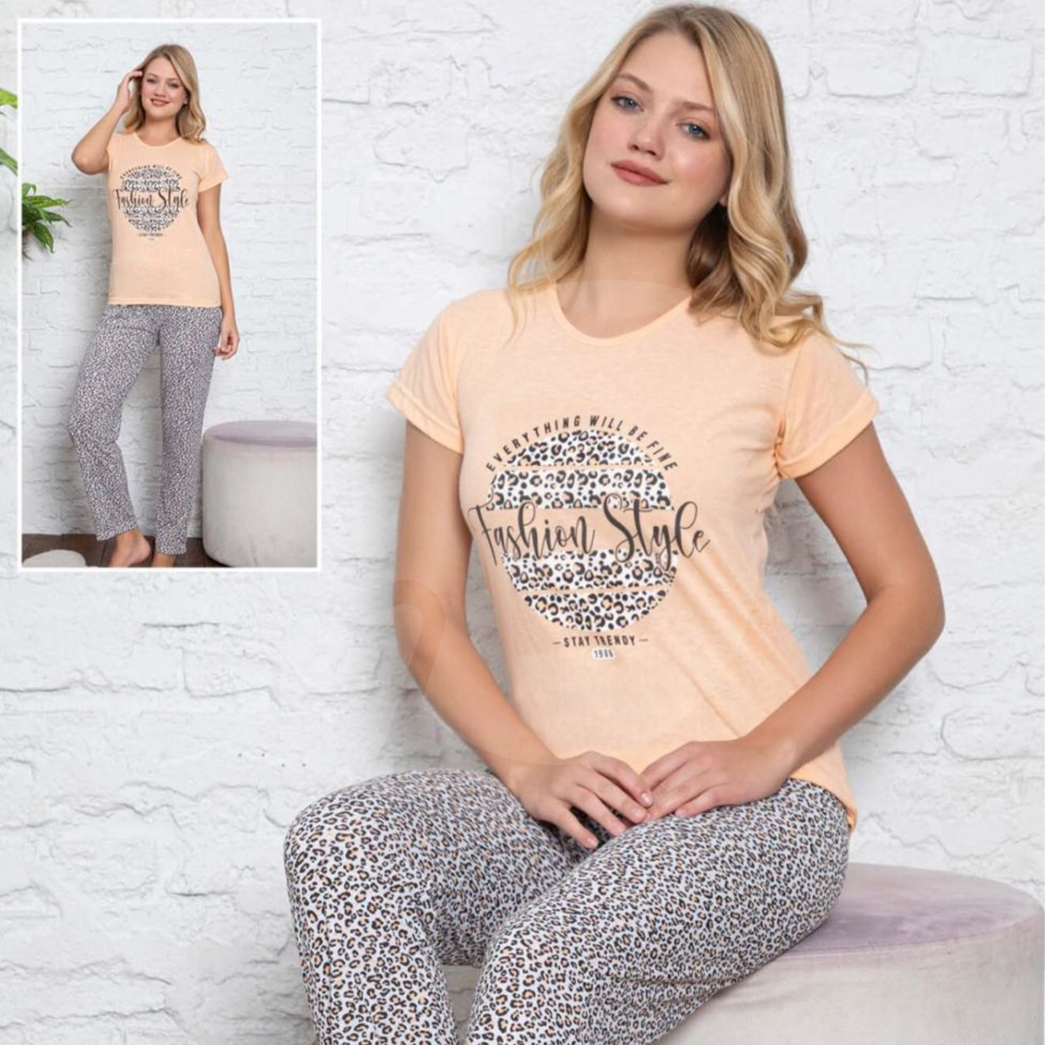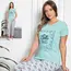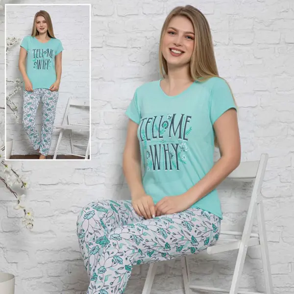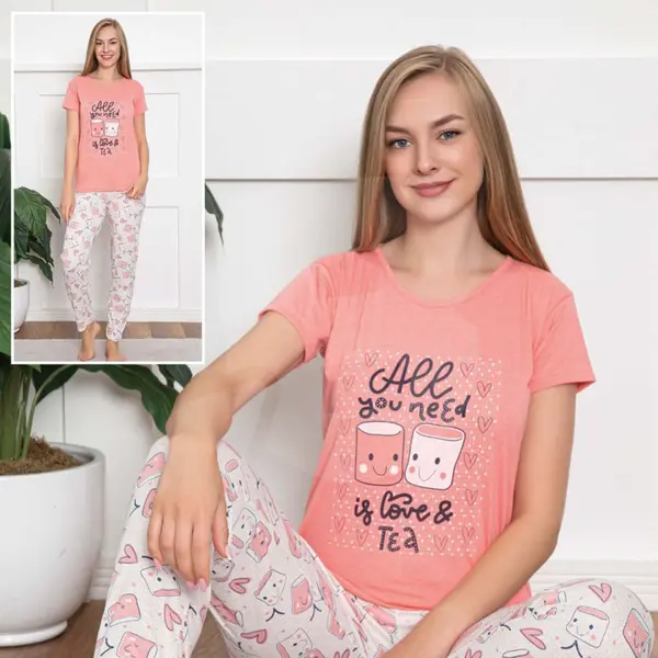 Designul este format dintr-un tricou cu mânecă scurtă și pantaloni asortați, fiind ideal pentru sezonul cald sau pentru persoanele care preferă o temperatură constantă și lejeritate în timpul somnului. Croiala este una modernă și feminină, gândită să avantajeze orice siluetă, oferind în același timp libertate deplină de mișcare. Un aspect major al acestui amestec de materiale este rezistența la șifonare; pijama își păstrează aspectul îngrijit chiar și după o noapte întreagă de somn sau după numeroase cicluri de spălare la mașină, fără a se deforma sau a se lărgi.