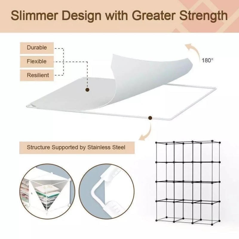 Panourile sunt fabricate din polipropilenă (PP) ecologică, un material non-toxic, rezistent și flexibil, susținut de un cadru metalic robust care asigură stabilitatea întregului ansamblu. Ușile compartimentelor protejează conținutul de praf, menținând un aspect curat și ordonat în cameră. Un avantaj major pentru părinți este întreținerea extrem de ușoară; materialul este impermeabil și se curăță rapid cu o lavetă umedă. Sistemul de montaj tip DIY (do-it-yourself), prin conectori din ABS, permite asamblarea rapidă fără unelte, oferindu-vă totodată libertatea de a reconfigura modulele în funcție de evoluția nevoilor copilului dumneavoastră.