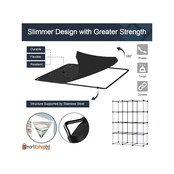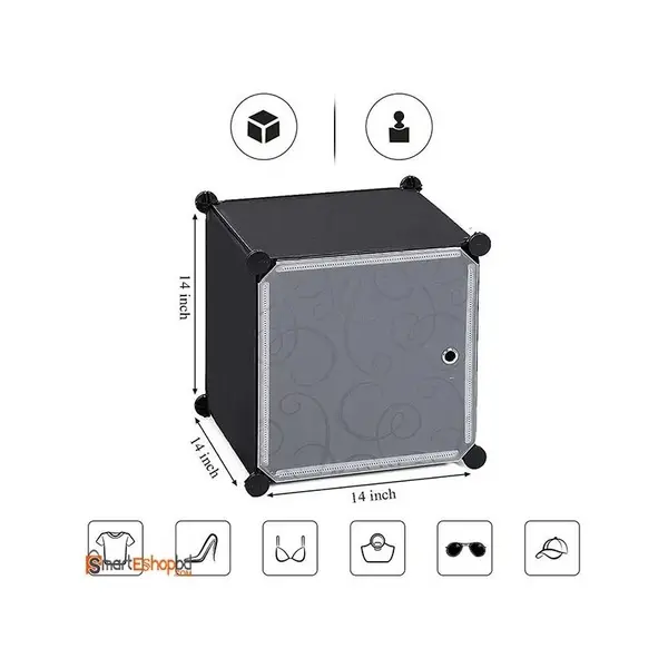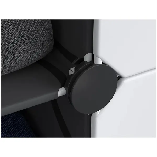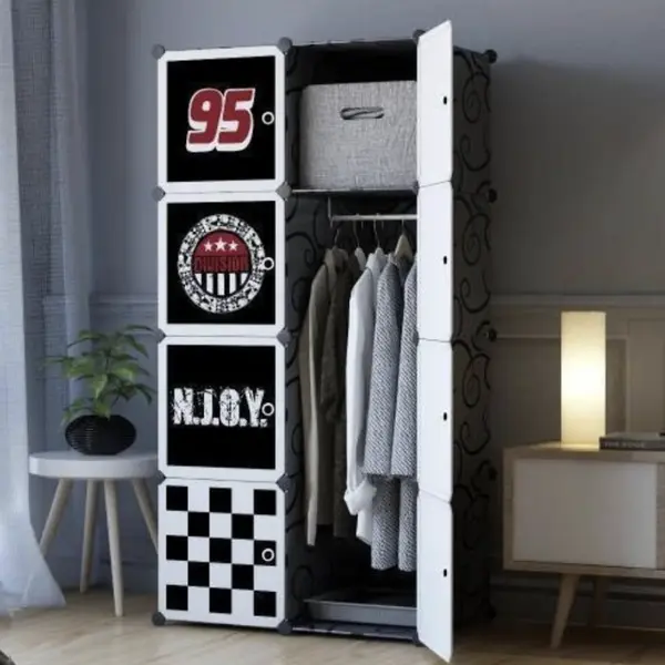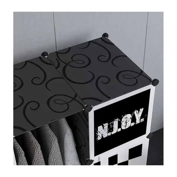 Panourile sunt fabricate din polipropilenă (PP) de înaltă calitate, un material non-toxic, durabil și flexibil, susținut de un cadru metalic robust care garantează stabilitatea întregului ansamblu. Designul negru oferă un aspect contemporan, fiind o alegere excelentă pentru camerele de tineret sau decorurile minimaliste. Ușile compartimentelor protejează eficient conținutul de praf, menținând un aspect vizual ordonat în cameră. Un avantaj major pentru părinți este întreținerea facilă: materialul este impermeabil și se curăță rapid cu o lavetă umedă. Sistemul de montaj DIY (do-it-yourself), prin conectori din ABS, permite asamblarea rapidă fără unelte, oferindu-vă flexibilitatea de a reconfigura modulele ori de câte ori este necesar.