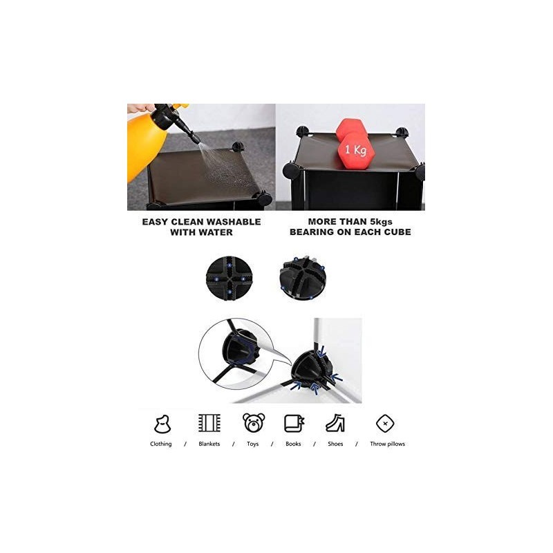 Panourile sunt fabricate din polipropilenă (PP) de înaltă calitate, un material ecologic, non-toxic și extrem de rezistent, susținut de un cadru metalic discret, dar robust. Ușile compartimentelor protejează conținutul de praf și mențin un aspect vizual curat în încăpere. Un mare avantaj pentru părinți este ușurința de întreținere: materialul este impermeabil și se curăță rapid cu o lavetă umedă, fiind rezistent la pete sau urme de degete. Sistemul de montaj tip DIY (do-it-yourself), prin conectori din ABS, permite asamblarea rapidă și sigură, fără a fi nevoie de unelte speciale, oferind totodată posibilitatea de a reconfigura modulele în funcție de spațiul disponibil.