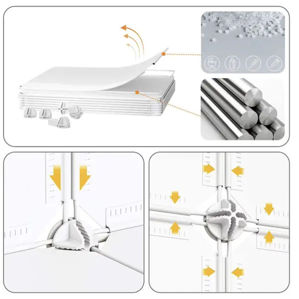 Construit din panouri de polipropilenă (PP) de înaltă calitate și susținut de un cadru metalic robust, acest dulap asigură o stabilitate excelentă și o durabilitate crescută. Ușile cu imprimeu Paris (Turnul Eiffel și elemente vintage) protejează eficient hainele și obiectele personale de praf, menținând în același timp un aspect ordonat și plăcut. Materialul este impermeabil și foarte ușor de curățat, fiind suficientă o simplă ștergere periodică. Sistemul de montaj tip DIY, bazat pe conectori din ABS, vă permite să asamblați produsul rapid și fără efort, oferindu-vă totodată libertatea de a reconfigura modulele în funcție de spațiul disponibil.