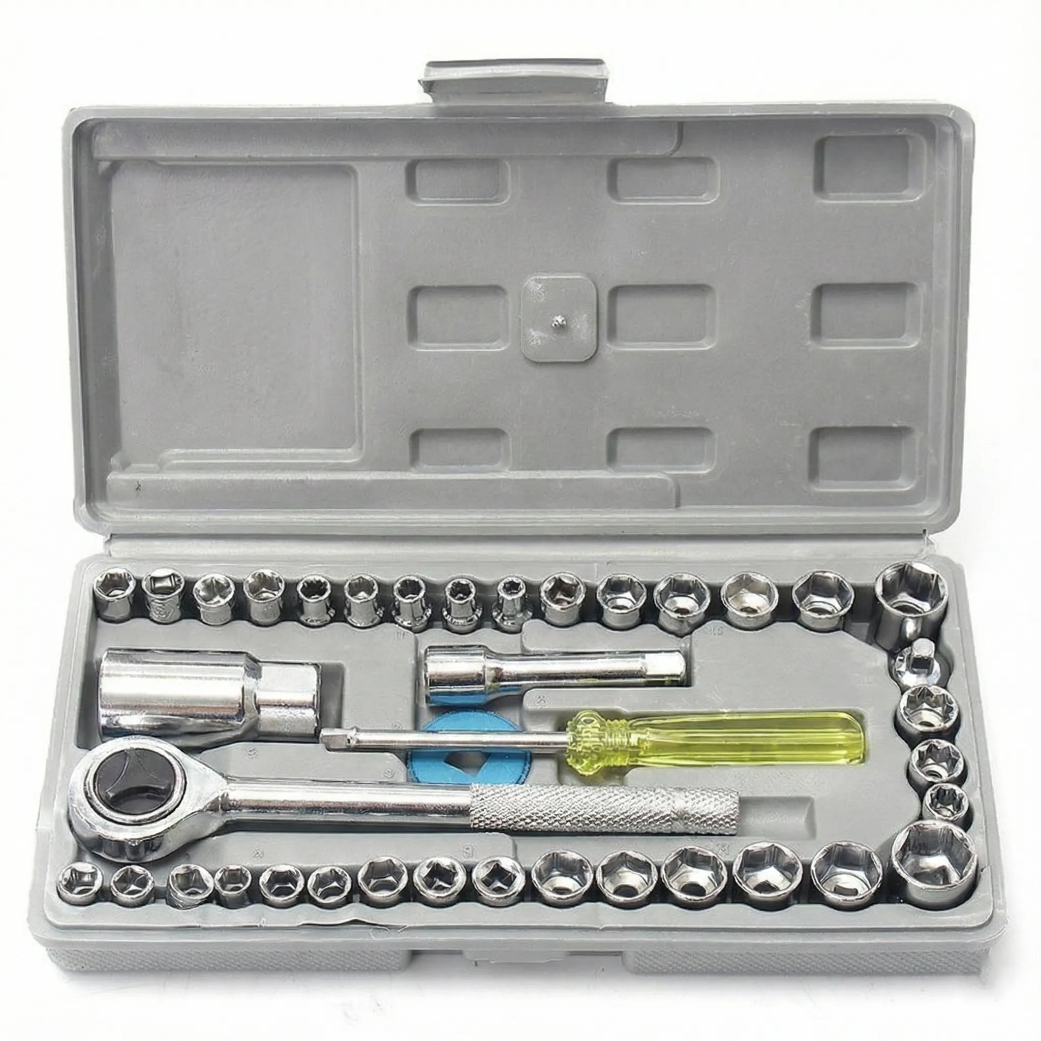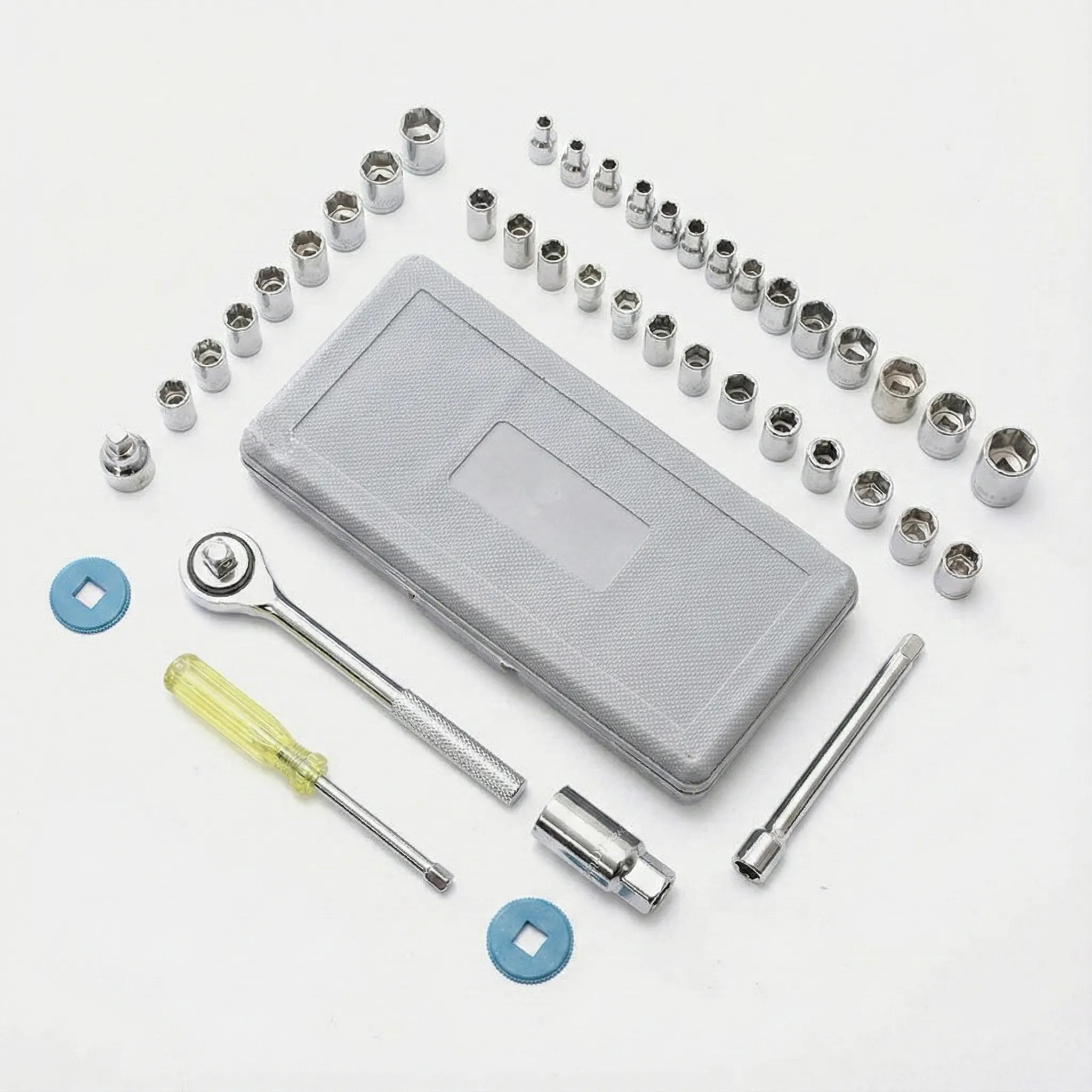 Cutia de depozitare din plastic ranforsat nu este doar pentru transport; aceasta dispune de locașuri marcate pentru fiecare piesă, menținând uneltele fixate chiar și în timpul vibrațiilor de la transport. Acest sistem de organizare îți permite să identifici vizual instantaneu dacă o piesă lipsește, economisind timp prețios la finalul fiecărei lucrări.